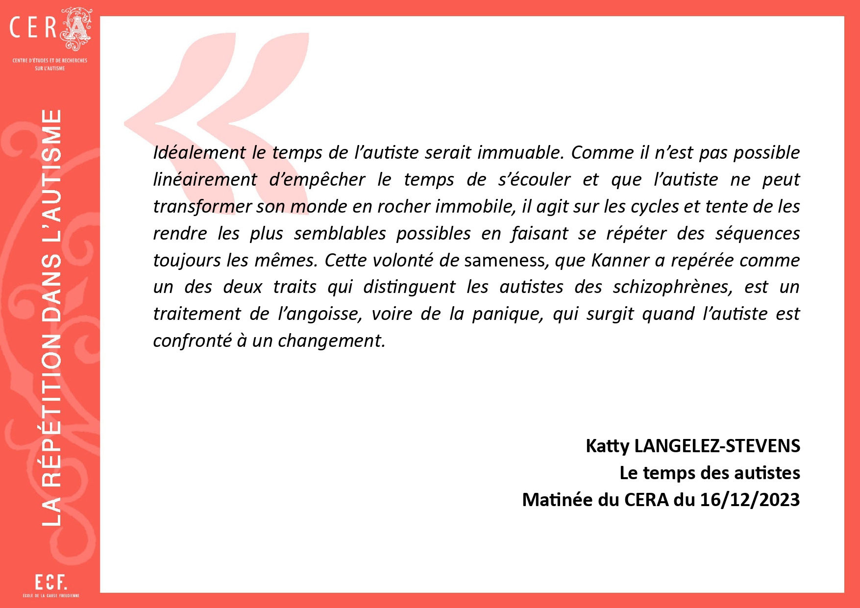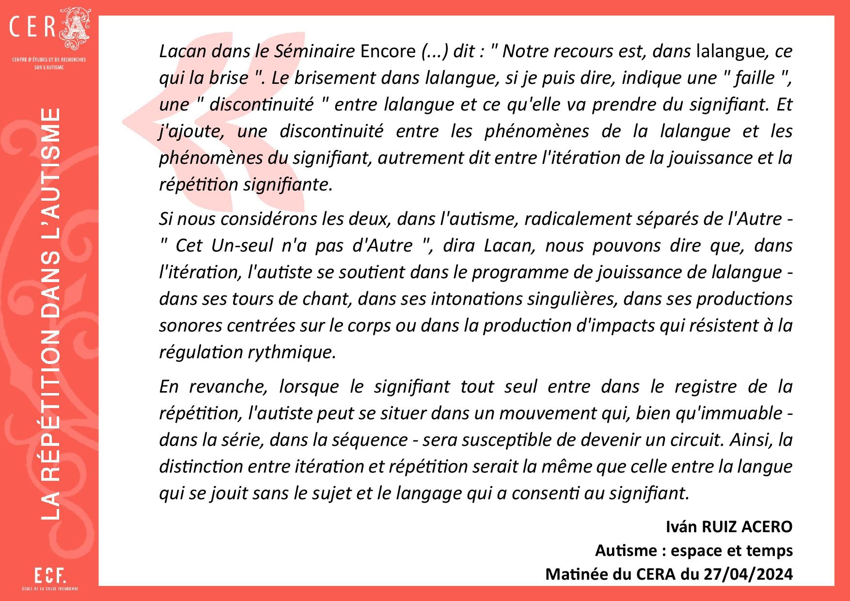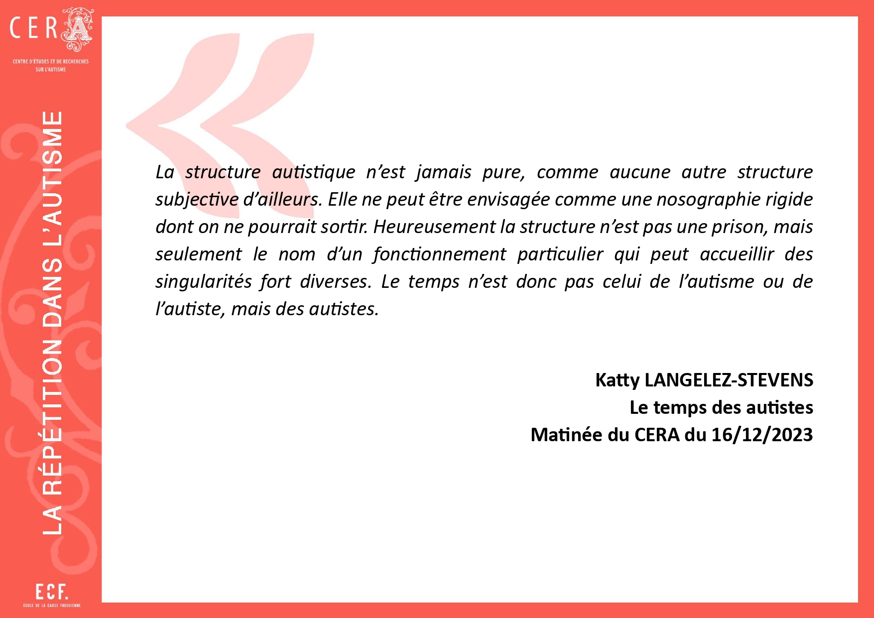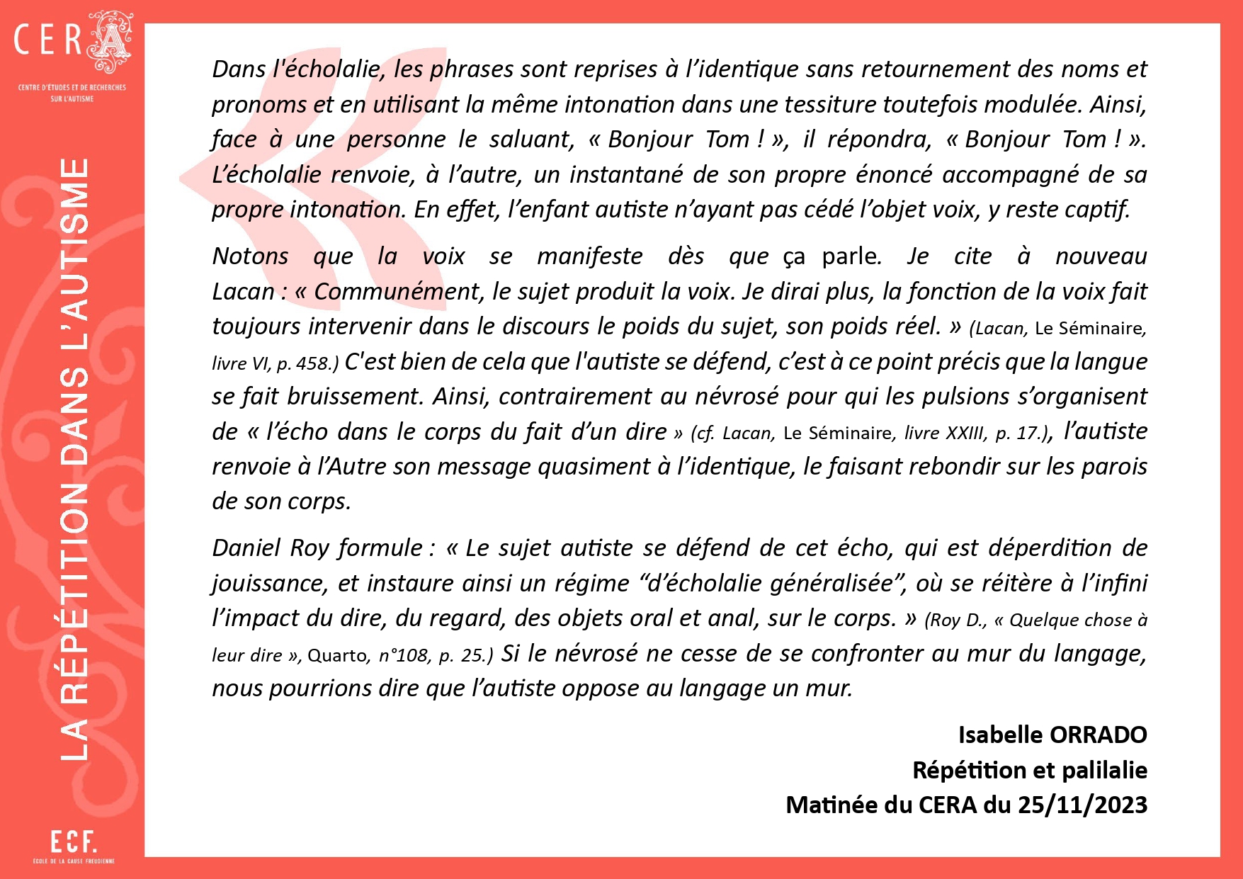 [11]. Laurent E., La bataille de l’autisme, Paris, Navarin/Le champ freudien, 2012, p. 159.