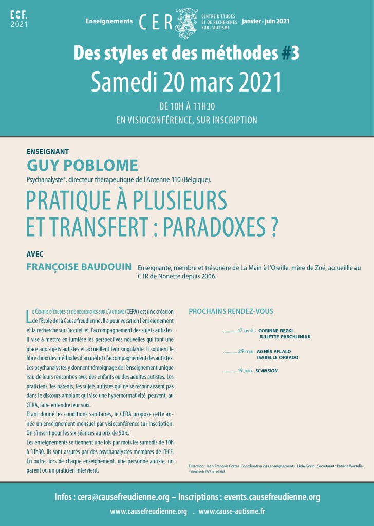 Cette troisième matinée de l’enseignement 2021 du CERA , samedi 20 mars 2021, examine la question « Pratique à plusieurs et transfert : paradoxes ? », par Guy Poblome, psychanalyste membre de l’ECF et de l’AMP, directeur thérapeutique de l’Antenne 110 (Belgique). Avec Françoise Baudouin, enseignante, membre trésorière de l’association La Main à l’Oreille et mère de Zoé, accueillie au CTR de Nonette depuis 2006.