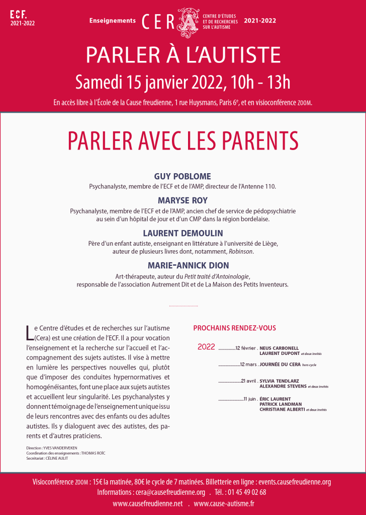 Rendez-vous samedi 15 janvier pour la quatrième matinée des enseignements 2021-2022 du CERA sur le thème « Parler à l’autiste ».