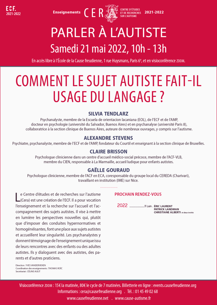Intervenants : Silvia Tendlarz, psychanalyste, membre de la Escuela de orientacion lacaniana (EOL), de l’ECF et de l’AMP, docteur en psychologie (université du Salvador, Buenos Aires) et en psychanalyse (université Paris 8), collaboratrice à la section clinique de Buenos Aires, auteure de nombreux ouvrages, y compris sur l’autisme ; et Alexandre Stevens, psychiatre, psychanalyste membre de l’ECF et de l’AMP, fondateur du Courtil et enseignant à la section clinique de Bruxelles.