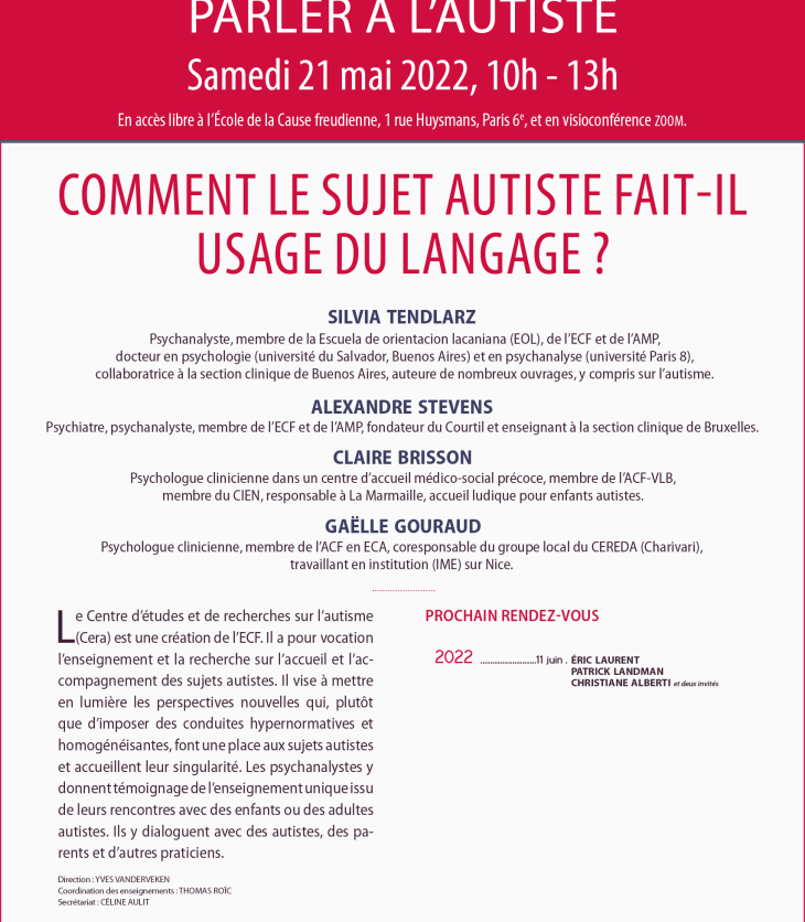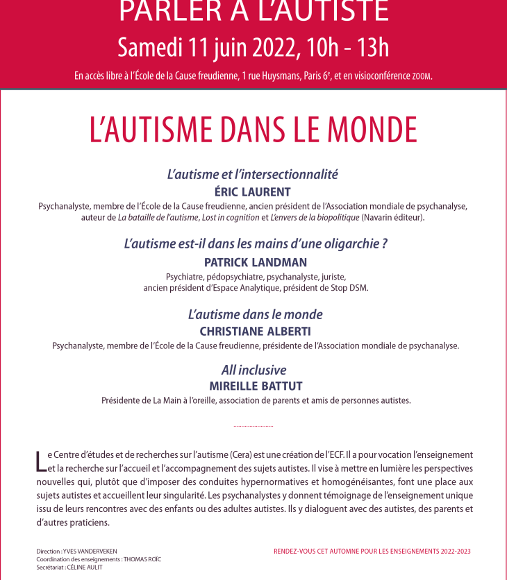 Le CERA organise sa journée d’étude 2022 sur le thème « Clinique et politique de l’autisme ».…